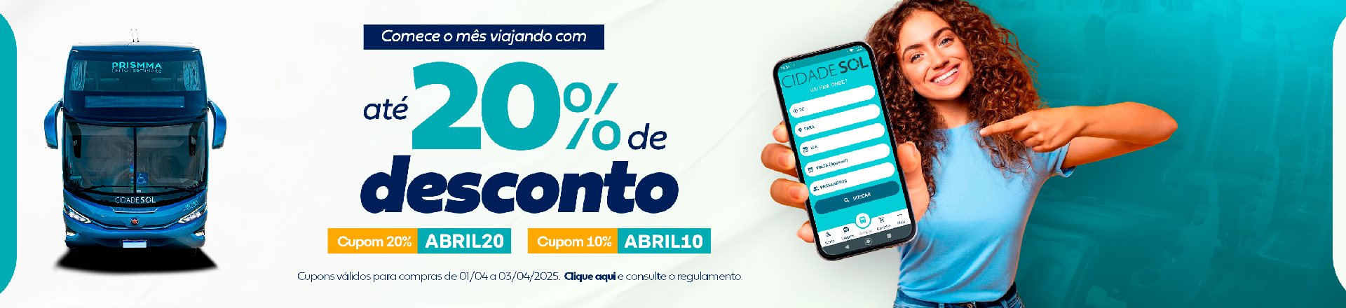 3.           Os descontos de 20% e 10% da campanha promocional com cupons de descontos (ABRIL20 e ABRIL10), serão aplicados apenas sobre as tarifas das passagens dos trechos promocionais. Portanto, não estão inclusas nos descontos as tarifas de pedágio, seguro facultativo e de utilização de terminais;