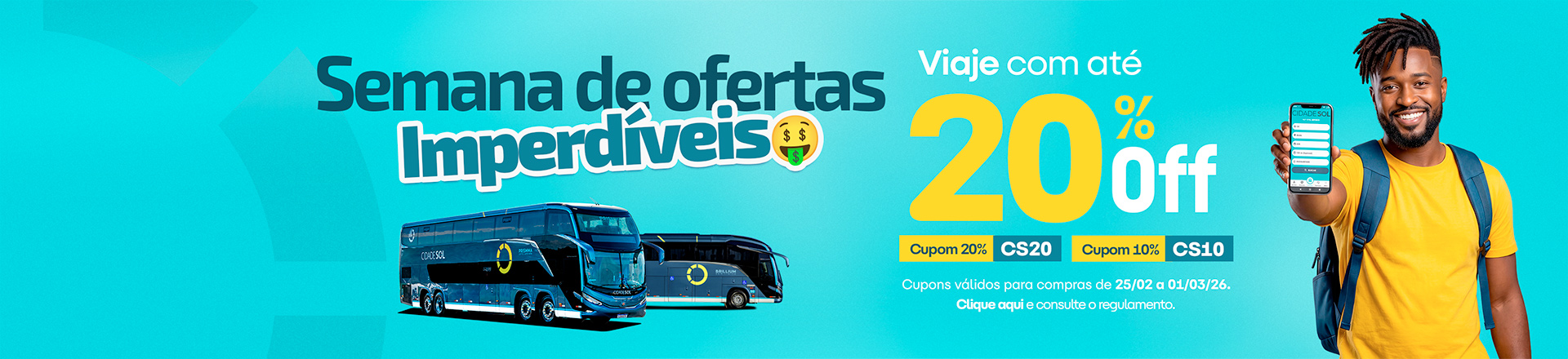 - Os descontos de 20% e 10% da campanha promocional com cupons de descontos (CS20 e CS10), serão aplicados apenas sobre as tarifas das passagens dos trechos promocionais. Portanto, não estão inclusas nos descontos as tarifas de pedágio, seguro facultativo e de utilização de terminais;